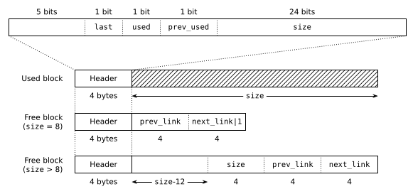 prev_linkandnext_link, but if we look closely it turns out that there are actually 4 bits available. This is becauseprev_linkandnext_linkare pointers to other blocks, thus multiples of 4 (since blocks are 4-aligned). Therefore, the 2 low-order bits of both pointers are always 0, and I can steal one of them to store a flag that identifies 8-byte blocks.