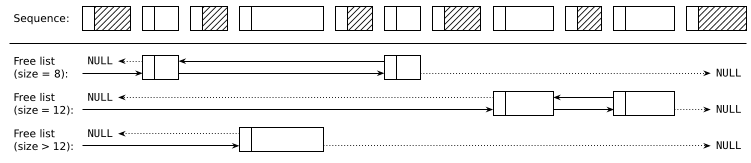 You've probably figured it out by now but this is where the name “segregated best-fit” comes from, as blocks of different sizes are partitioned (segregated) into appropriate doubly-linked lists.
