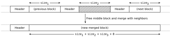 Of course we want this splitting to be as temporary as possible; if at any point in the future both blocks are free again, we need them merged back. Fortunately this is fairly easy to track down; all cases of adjacent free blocks are caused by a free(), and we can catch 'em all if we simply merge newly-freed blocks with their neighbors.