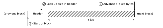 Notice how we can pretty easily navigate the sequence forwards: from a pointer to the start of a block we can find a pointer to its end (ie. to the start of the next block) because the block's size is indicated in the header.