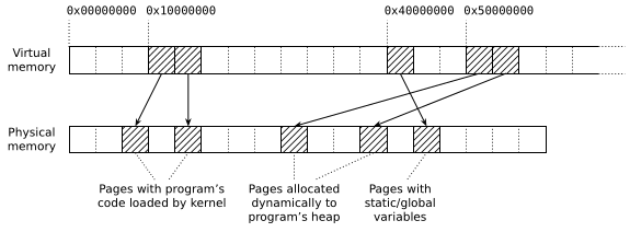 This process is called paging. Essentially, both the virtual and physical address spaces are divided into pages (of varying size but most commonly 4 kB) and the kernel decides which pages of virtual memory should be mapped to which pages of physical memory. When the program makes a memory access, the CPU checks if the accessed pointer falls into a mapped page. If so, then the associated physical page is accessed. Otherwise, the access is streng verboten and the program crashes with a segfault.(3) This gives the kernel complete control over what memory processes can read and write, and thus achieves the separation goals I mentioned earlier.