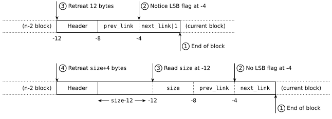 - Free blocks of size ≥ 12 simply store their size at offset -12 from the end.