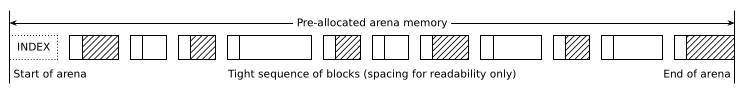 Blocks are stored immediately next to each other with no spacing, forming a long sequence that covers the entire heap region (the arena), apart from a small index structure placed at the start: