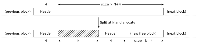Step 1 is what makes this algorithm a best-fit, as it finds the “best” block for the allocation (the one that's as close as possible to the requested size). Confusingly this isn't necessarily the best choice(7), and there are many other strategies. Anyway, the interesting part for now is that if we decide on a block that's larger than needed, we split it off so we don't waste any memory: